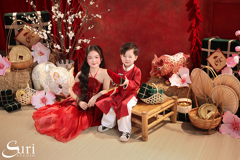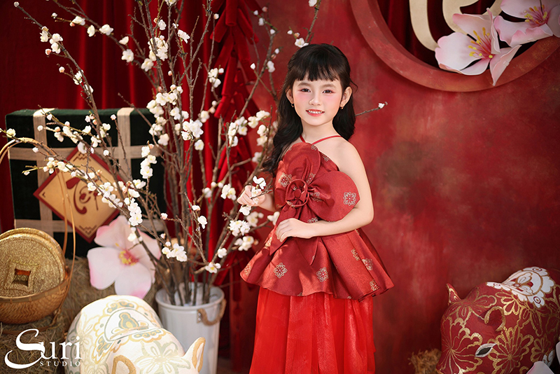 Với concept Hoa Xuân Cát Tường, Suri gửi gắm trọn vẹn tinh thần Tết truyền thống qua tone đỏ ấm áp, hình ảnh lợn